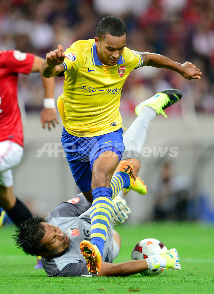 浦和レッドダイヤモンズのGK山岸範宏(Norihiro Yamagishi)に得点機を阻まれるアーセナルのテオ・ウォルコット(Theo Walcott、2013年7月26日撮影)。(c)AFP/Toru YAMANAKA