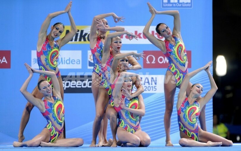 【7月27日 AFP】第15回世界水泳選手権(15th FINA World Championships)は26日、スペイン・バルセロナ(Barcelona)でシンクロナイズドスイミングのチームフリールーティン(FR)決勝が行われ、ロシアが97.400点で優勝した。
