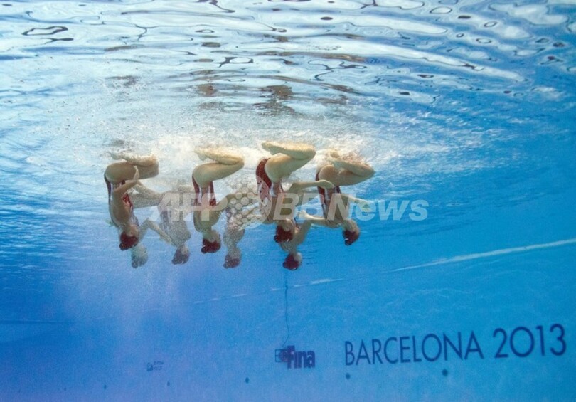 【7月28日 AFP】スペイン・バルセロナ(Barcelona)で開催されている第15回世界水泳選手権(15th FINA World Championships)。水中カメラで撮影されたシンクロナイズドスイミング・チームの演技の様子。(c)AFP