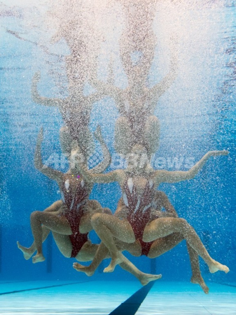 【7月28日 AFP】スペイン・バルセロナ(Barcelona)で開催されている第15回世界水泳選手権(15th FINA World Championships)。水中カメラで撮影されたシンクロナイズドスイミング・チームの演技の様子。(c)AFP