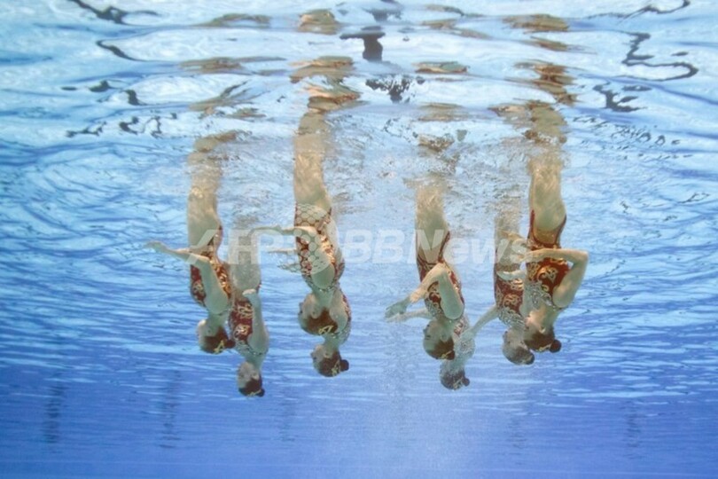 【7月28日 AFP】スペイン・バルセロナ(Barcelona)で開催されている第15回世界水泳選手権(15th FINA World Championships)。水中カメラで撮影されたシンクロナイズドスイミング・チームの演技の様子。(c)AFP