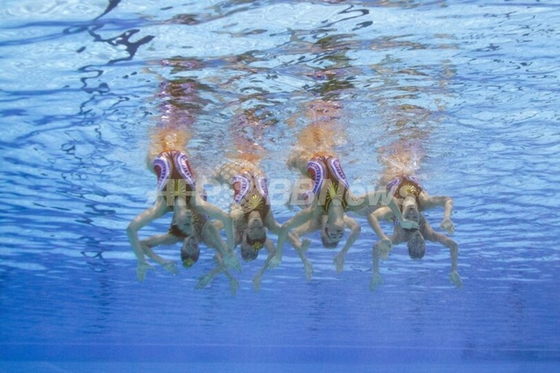 【7月28日 AFP】スペイン・バルセロナ(Barcelona)で開催されている第15回世界水泳選手権(15th FINA World Championships)。水中カメラで撮影されたシンクロナイズドスイミング・チームの演技の様子。(c)AFP