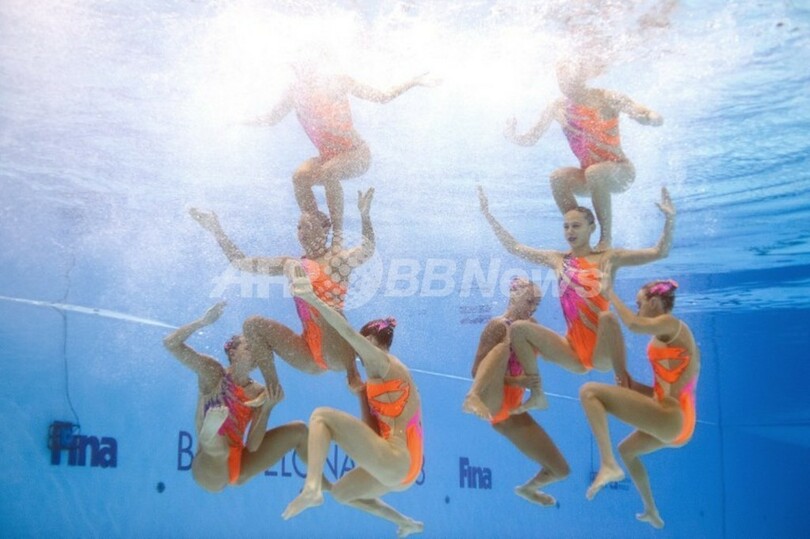 【7月28日 AFP】スペイン・バルセロナ(Barcelona)で開催されている第15回世界水泳選手権(15th FINA World Championships)。水中カメラで撮影されたシンクロナイズドスイミング・チームの演技の様子。(c)AFP