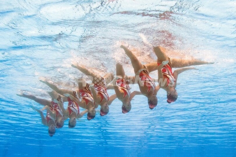 【7月28日 AFP】スペイン・バルセロナ(Barcelona)で開催されている第15回世界水泳選手権(15th FINA World Championships)。水中カメラで撮影されたシンクロナイズドスイミング・チームの演技の様子。(c)AFP