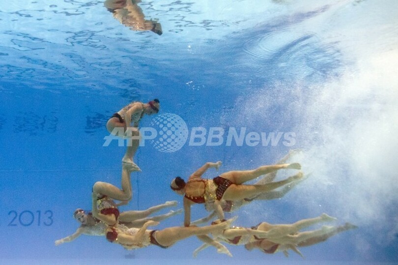 【7月28日 AFP】スペイン・バルセロナ(Barcelona)で開催されている第15回世界水泳選手権(15th FINA World Championships)。水中カメラで撮影されたシンクロナイズドスイミング・チームの演技の様子。(c)AFP