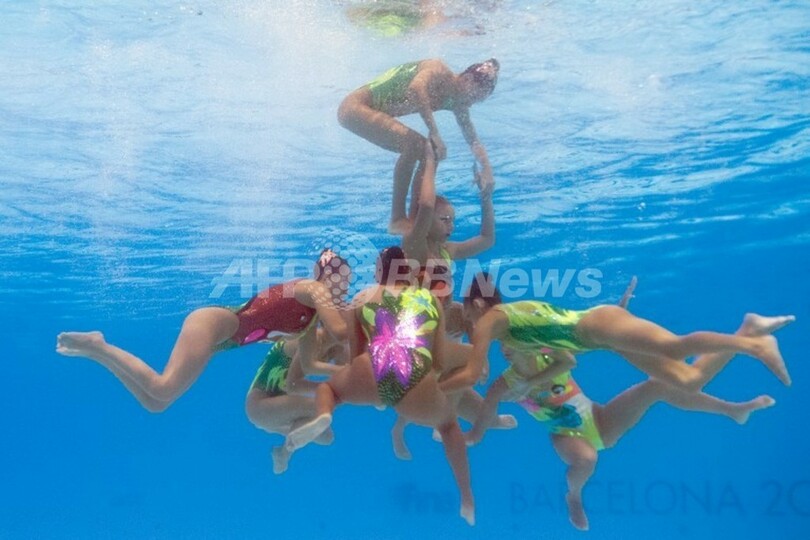 【7月28日 AFP】スペイン・バルセロナ(Barcelona)で開催されている第15回世界水泳選手権(15th FINA World Championships)。水中カメラで撮影されたシンクロナイズドスイミング・チームの演技の様子。(c)AFP