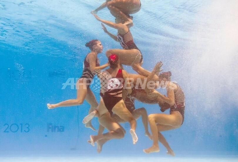 【7月28日 AFP】スペイン・バルセロナ(Barcelona)で開催されている第15回世界水泳選手権(15th FINA World Championships)。水中カメラで撮影されたシンクロナイズドスイミング・チームの演技の様子。(c)AFP