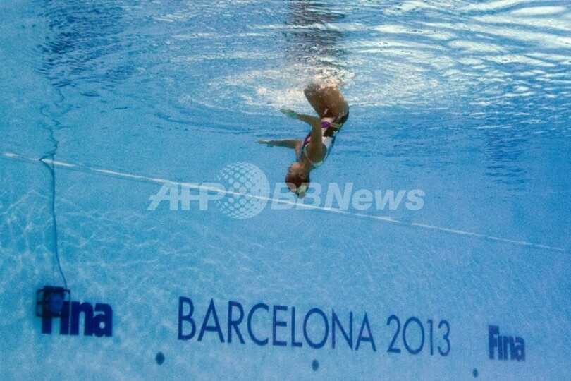 【7月28日 AFP】スペイン・バルセロナ(Barcelona)で開催されている第15回世界水泳選手権(15th FINA World Championships)。水中カメラで撮影されたシンクロナイズドスイミングのソロとデュエットの演技。(c)AFP