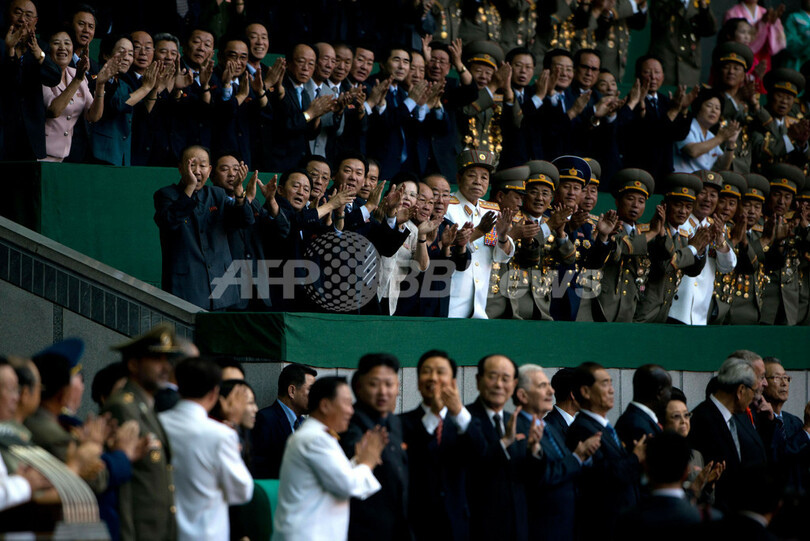 写真は、金正恩(キム・ジョンウン、Kim Jong-Un、中央)第1書記に拍手を送る政府高官ら(2013年7月26日撮影)。(c)AFP/Ed Jones
