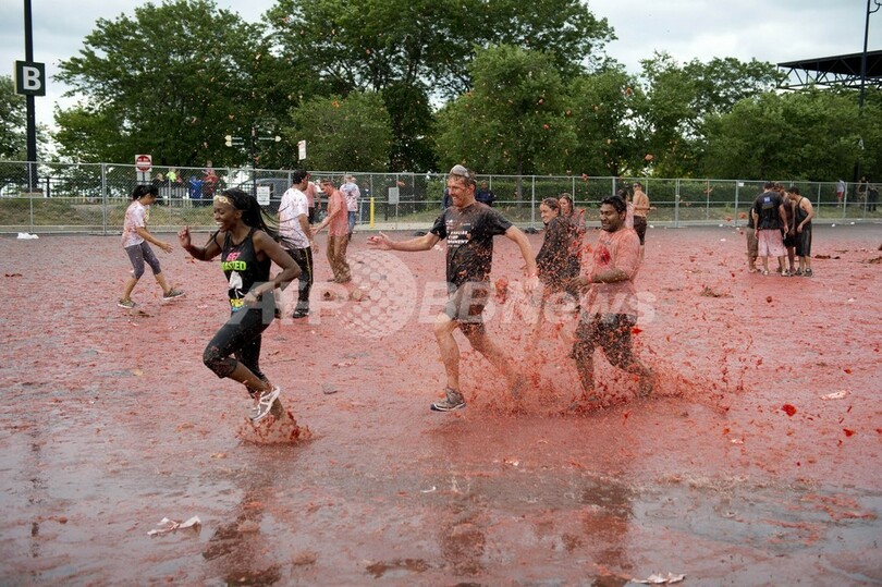 【7月28日 AFP】米イリノイ(Illinois)州シカゴ(Chicago)にあるソルジャー・フィールド(Soldier Field)競技場の駐車場で27日、「トマト・ブラスト(Tomato Blast、トマトの爆発)」フェスティバルが開催され、会場は「破裂」したトマトで埋め尽くされた。