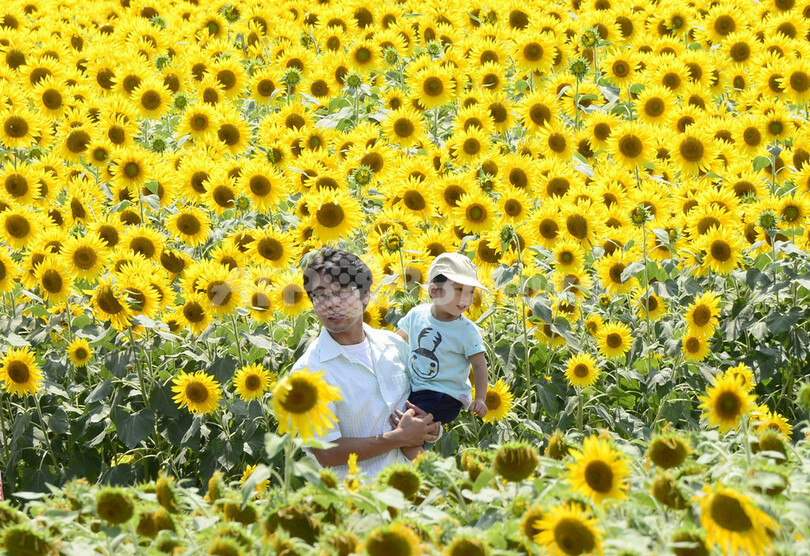 同市では毎年2つの地区にあるひまわり畑で7月と8月の2回、およそ1週間にわたってひまわりまつりを開催している。(c)AFP