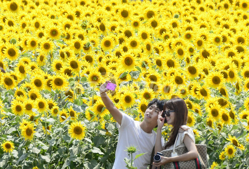 同市では毎年2つの地区にあるひまわり畑で7月と8月の2回、およそ1週間にわたってひまわりまつりを開催している。(c)AFP