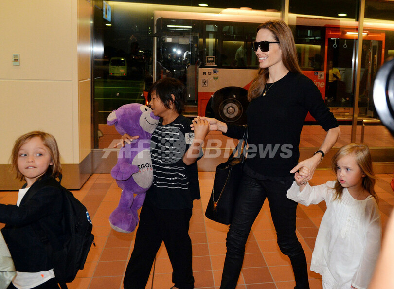 写真は、子どもたちと来日したジョリー(右から2人目、2013年7月28日撮影)。(c)AFP/Yoshikazu TSUNO