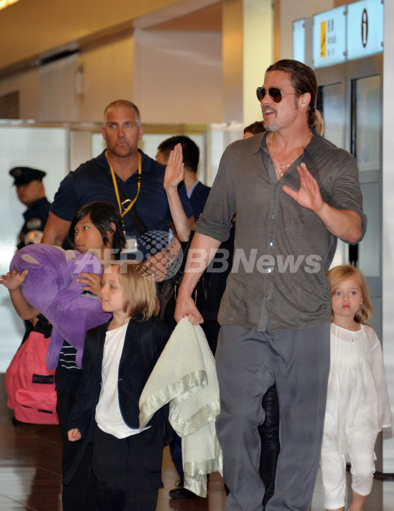 【7月29日 AFP】米俳優ブラッド・ピット(Brad Pitt)とそのパートナーで女優のアンジェリーナ・ジョリー(Angelina Jolie)が28日、ピット最新主演映画『ワールド・ウォーZ(World War Z)』のプロモーションのために来日した。東京・羽田空港(Haneda International Airport)に降り立ったピットとジョリーは子どもたちを引き連れ、出迎えたファンたちに笑顔で応えた。(c)AFP
