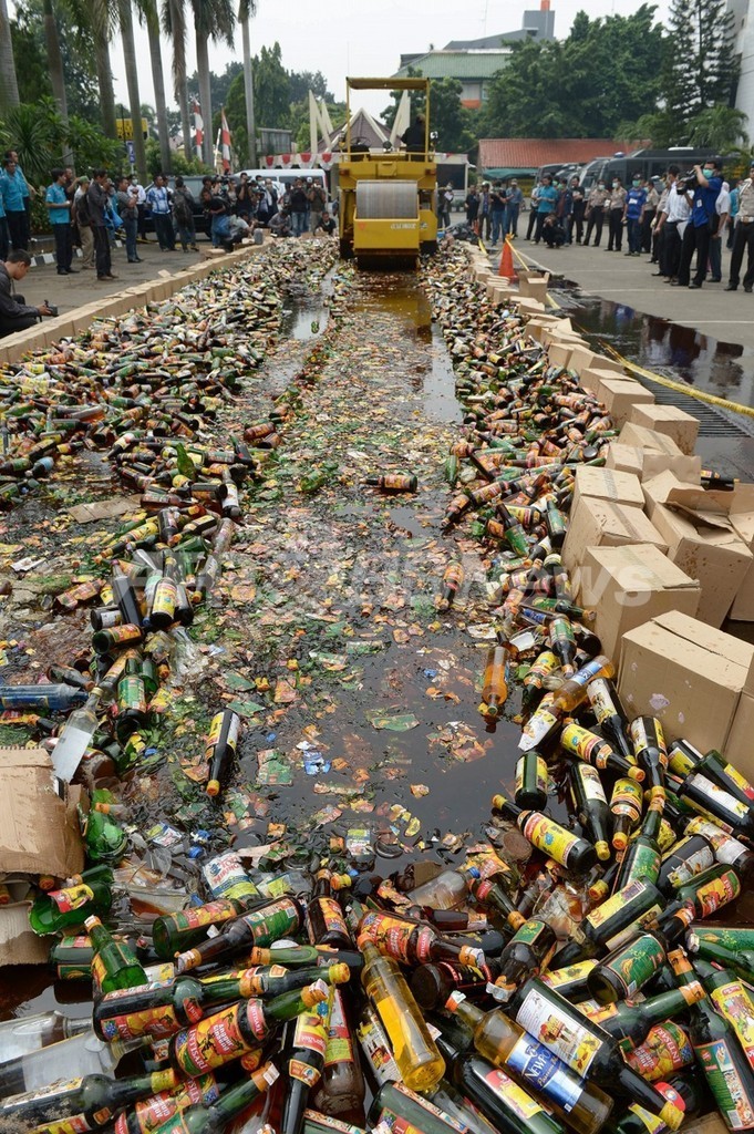 ニュース 政治・経済 1万本以上の酒瓶をローラー重機で破砕、インドネシア 2013年7月29日 18:29 発信地:ジャカルタ/インドネシア [ アジア・オセアニア インドネシア ] このニュースをシェア ‹ › ❮ 5/10 ❯ インドネシアの首都ジャカルタ(Jakarta)の警察署前で29日、押収された酒類の瓶1万681本がローラー重機で破砕処理された。これらの酒瓶は、イスラム教の断食月「ラマダン(Ramadan)」期間中の警察の取り締まりで販売許可証を提示できなかった業者から押収されたもので、大半はインドネシア国内で生産されたものという(2013年7月29日撮影)。(c)AFP/ADEK BERRY 画像作成中 ! 【7月29日 AFP】インドネシアの首都ジャカルタ(Jakarta)の警察署前で29日、押収された酒類の瓶1万681本がローラー重機で破砕処理された。これらの酒瓶は、イスラム教の断食月「ラマダン(Ramadan)」期間中の警察の取り締まりで販売許可証を提示できなかった業者から押収されたもので、大半はインドネシア国内で生産されたものという。(c)AFP 政治・経済 一覧へ> メディア・報道関係・法人の方向け 写真・動画 購入のお問合せ>