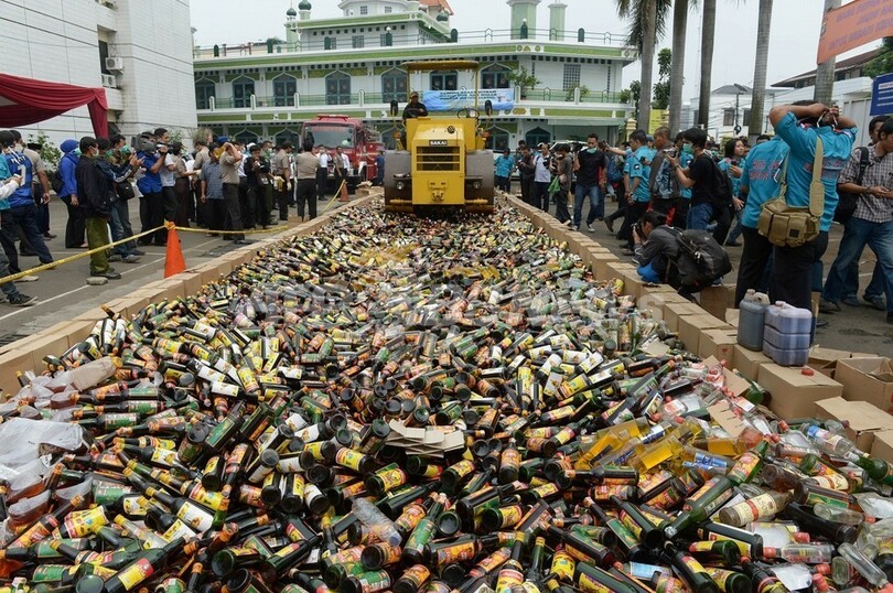 ニュース 政治・経済 1万本以上の酒瓶をローラー重機で破砕、インドネシア 2013年7月29日 18:29 発信地:ジャカルタ/インドネシア [ アジア・オセアニア インドネシア ] このニュースをシェア ‹ › ❮ 4/10 ❯ インドネシアの首都ジャカルタ(Jakarta)の警察署前で29日、押収された酒類の瓶1万681本がローラー重機で破砕処理された。これらの酒瓶は、イスラム教の断食月「ラマダン(Ramadan)」期間中の警察の取り締まりで販売許可証を提示できなかった業者から押収されたもので、大半はインドネシア国内で生産されたものという(2013年7月29日撮影)。(c)AFP/ADEK BERRY 画像作成中 ! 【7月29日 AFP】インドネシアの首都ジャカルタ(Jakarta)の警察署前で29日、押収された酒類の瓶1万681本がローラー重機で破砕処理された。これらの酒瓶は、イスラム教の断食月「ラマダン(Ramadan)」期間中の警察の取り締まりで販売許可証を提示できなかった業者から押収されたもので、大半はインドネシア国内で生産されたものという。(c)AFP 政治・経済 一覧へ> メディア・報道関係・法人の方向け 写真・動画 購入のお問合せ>