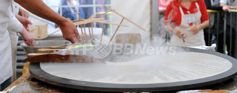 ニュース ライフ こぼれ話 世界一大きなクレープは84センチ!フランスで腕比べ 2013年7月30日 8:45 発信地:グラン/フランス [ ヨーロッパ フランス ] このニュースをシェア ‹ › ❮ 9/13 ❯ フランス西部グラン(Gourin)で28日、世界一大きなクレープを焼く大会が開かれ、大勢の参加者が腕を競った。優勝したファビエンヌ・カルヴェさんが焼いたクレープは直径84センチ。巨大なクレープを手に、満面の笑みを見せた。写真はクレープを焼く参加者(2013年7月28日撮影)。(c)AFP/FRED TANNEAU 画像作成中 ! 【7月30日 AFP】フランス西部グラン(Gourin)で28日、世界一大きなクレープを焼く大会が開かれ、大勢の参加者が腕を競った。優勝したファビエンヌ・カルヴェさんが焼いたクレープは直径84センチ。巨大なクレープを手に、満面の笑みを見せた。(c)AFP ライフ 一覧へ> メディア・報道関係・法人の方向け 写真・動画 購入のお問合せ>
