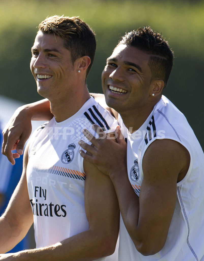 トレーニング中に笑顔を見せるカゼミーロ(Casemiro、右)とクリスティアーノ・ロナウド(Cristiano Ronaldo、2013年7月29日撮影)。(c)AFP/ROBYN BECK