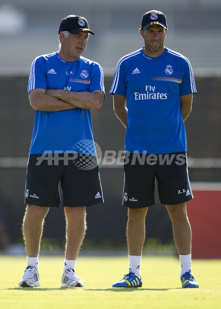 トレーニングを見守るジネディーヌ・ジダン(Zinedine Zidane)アシスタントコーチ(右)とカルロ・アンチェロッティ(Carlo Ancelotti)監督(2013年7月29日撮影)。(c)AFP/ROBYN BECK