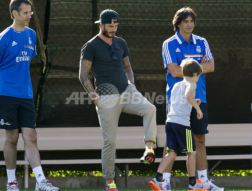 トレーニングを見守るデビッド・ベッカム(David Beckham)氏(中央、2013年7月29日撮影)。(c)AFP/ROBYN BECK