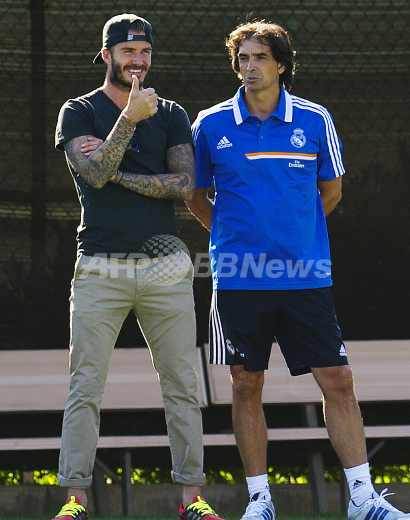 トレーニングを見守るデビッド・ベッカム(David Beckham)氏(左、2013年7月29日撮影)。(c)AFP/ROBYN BECK