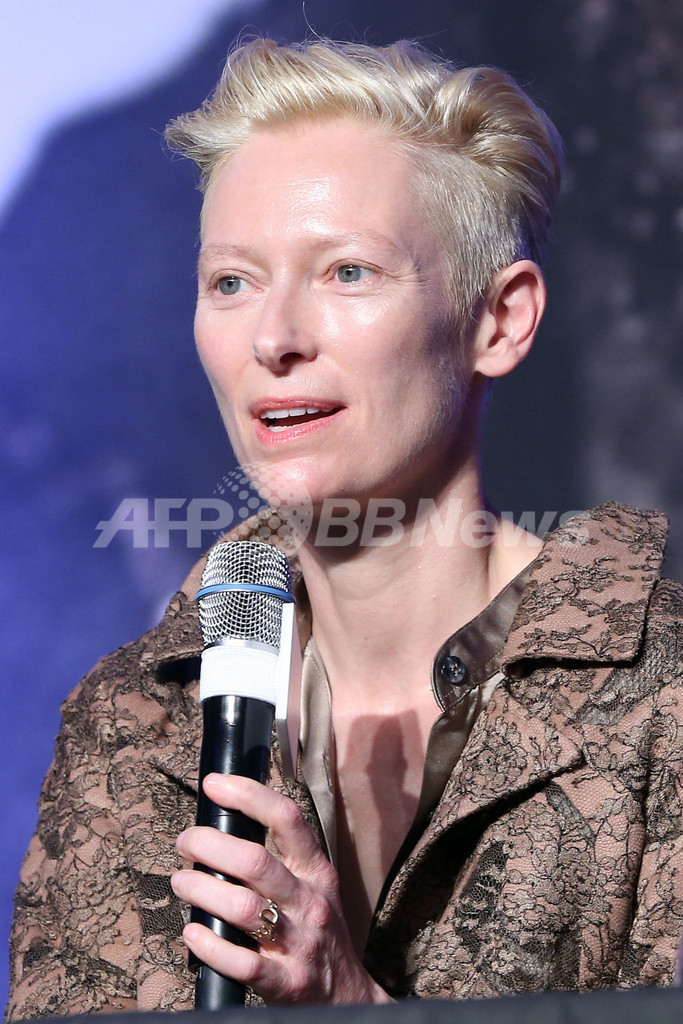 韓国・ソウル(Seoul)で先月29日、米韓共同制作の新作SF映画『スノーピアサー(原題、Snowpiercer)』の記者会見が開かれ、監督のボン・ジュノ(Bong Joon-Ho)をはじめ、出演者の韓国俳優ソン・ガンホ(Song Kang-Ho)、米俳優クリス・エヴァンス(Chris Evans)、米女優ティルダ・スウィントン(Tilda Swinton)、韓国女優コ・アソン(Ko A-Sung)が出席した。写真は、記者会見で報道陣の質問に応じるスウィントン(2013年7月29日撮影)。(c)STARNEWS
