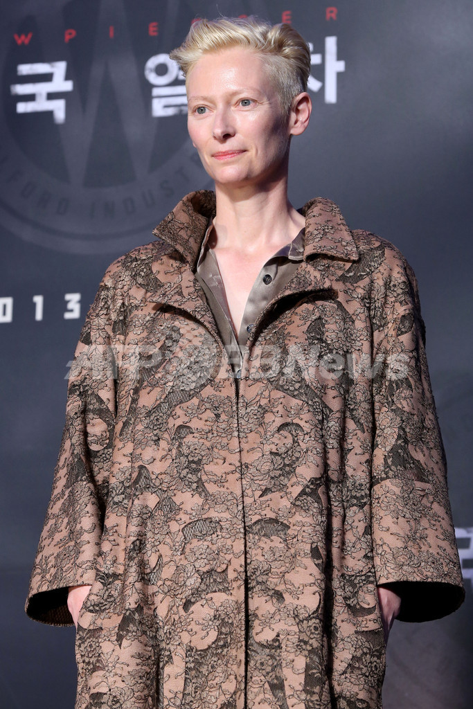韓国・ソウル(Seoul)で先月29日、米韓共同制作の新作SF映画『スノーピアサー(原題、Snowpiercer)』の記者会見が開かれ、監督のボン・ジュノ(Bong Joon-Ho)をはじめ、出演者の韓国俳優ソン・ガンホ(Song Kang-Ho)、米俳優クリス・エヴァンス(Chris Evans)、米女優ティルダ・スウィントン(Tilda Swinton)、韓国女優コ・アソン(Ko A-Sung)が出席した。写真は、記者会見のフォトセッションに登場したスウィントン(2013年7月29日撮影)。(c)STARNEWS