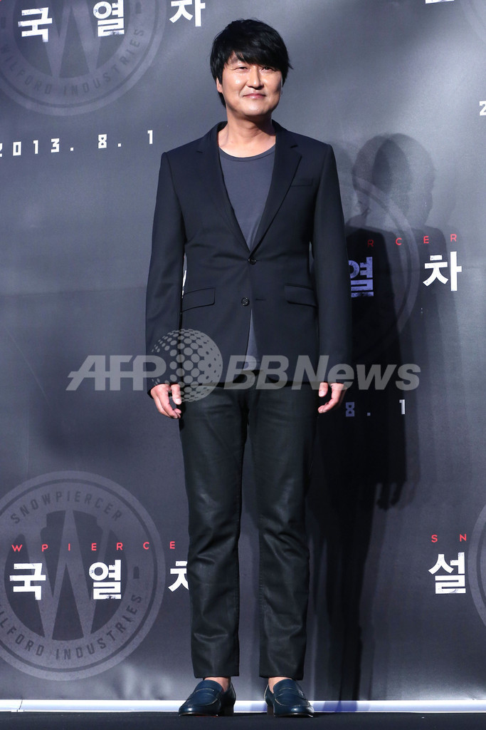 韓国・ソウル(Seoul)で先月29日、米韓共同制作の新作SF映画『スノーピアサー(原題、Snowpiercer)』の記者会見が開かれ、監督のボン・ジュノ(Bong Joon-Ho)をはじめ、出演者の韓国俳優ソン・ガンホ(Song Kang-Ho)、米俳優クリス・エヴァンス(Chris Evans)、米女優ティルダ・スウィントン(Tilda Swinton)、韓国女優コ・アソン(Ko A-Sung)が出席した。写真は、記者会見のフォトセッションに登場したソン・ガンホ(2013年7月29日撮影)。(c)STARNEWS