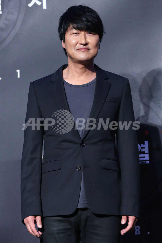 韓国・ソウル(Seoul)で先月29日、米韓共同制作の新作SF映画『スノーピアサー(原題、Snowpiercer)』の記者会見が開かれ、監督のボン・ジュノ(Bong Joon-Ho)をはじめ、出演者の韓国俳優ソン・ガンホ(Song Kang-Ho)、米俳優クリス・エヴァンス(Chris Evans)、米女優ティルダ・スウィントン(Tilda Swinton)、韓国女優コ・アソン(Ko A-Sung)が出席した。写真は、記者会見のフォトセッションに登場したソン・ガンホ(2013年7月29日撮影)。(c)STARNEWS