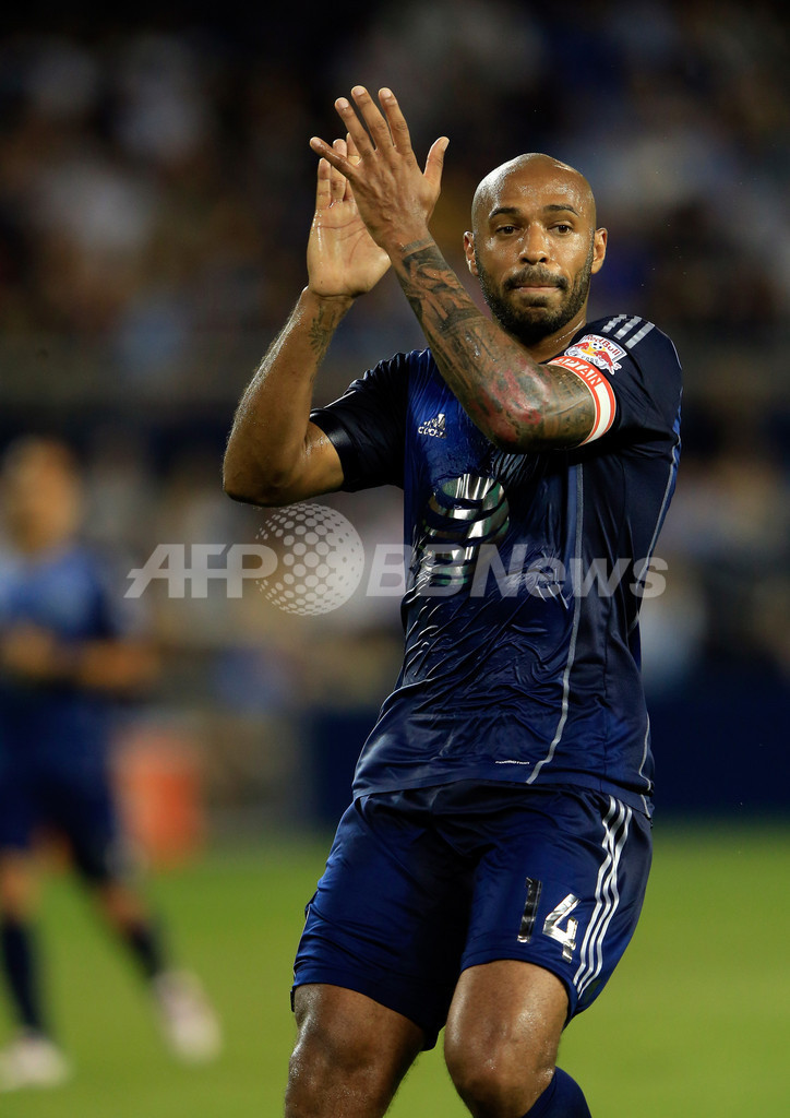 有利な判定を受けて拍手するMLSオールスターズのティエリ・アンリ(Thierry Henry、2013年7月31日撮影)。(c)AFP/Getty Images/Jamie Squire