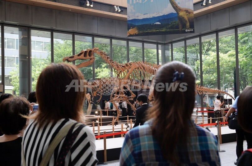 写真は、展示される「バリオニクス・ワルケリ(Baryonyx walkeri)」の骨格標本を眺める来場者(2013年8月1日撮影)。(c)AFP/TOSHIFUMI KITAMURA