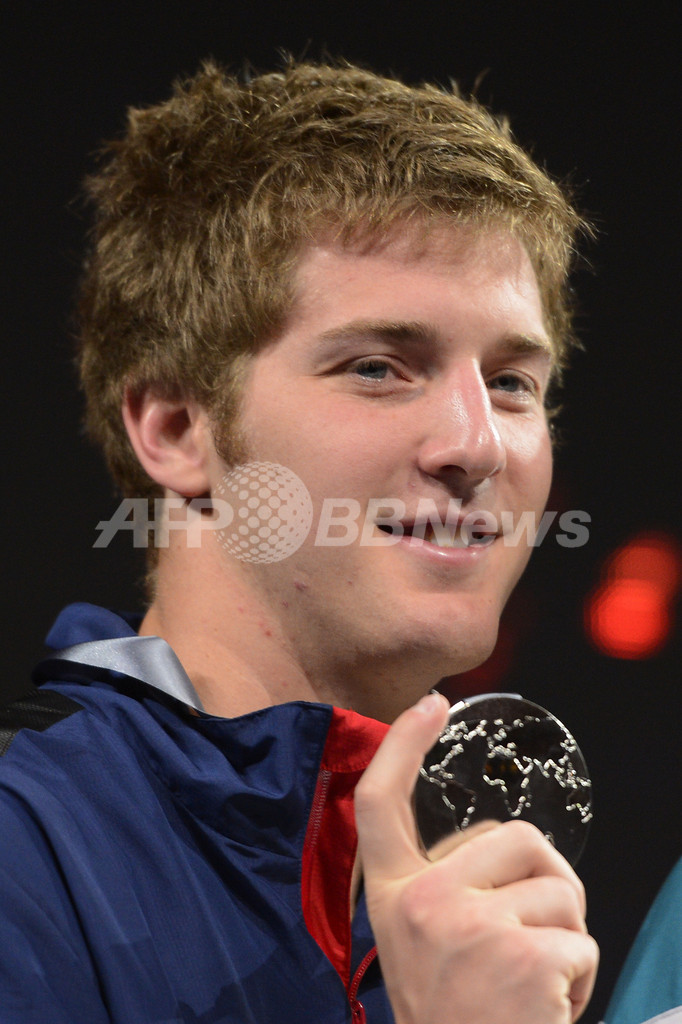 表彰式で銀メダルを手にするジミー・ファーゲン(2013年8月1日撮影)。(c)AFP/FABRICE COFFRINI