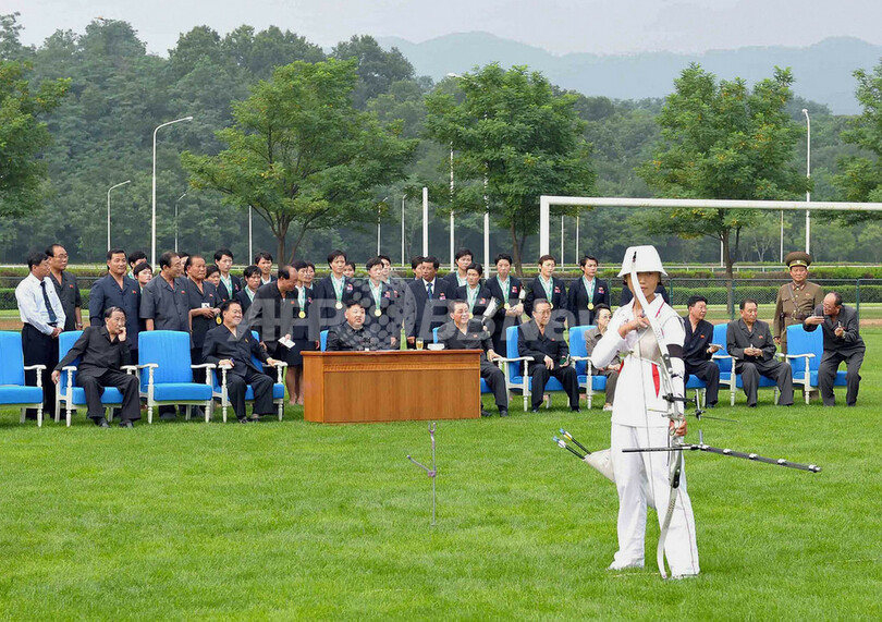 写真は、女子サッカー代表とともに、アーチェリーの試合を観戦する金正恩氏(中央、2013年8月1日提供)。(c)AFP/KCNA VIA KNS
