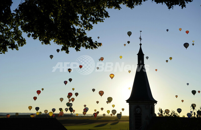 写真は、シャンブレー・ブシェール(Chambley-Bussieres)上空を飛行する色とりどりの気球(2013年7月31日撮影)。(c)AFP/ JEAN-CHRISTOPHE VERHAEGEN