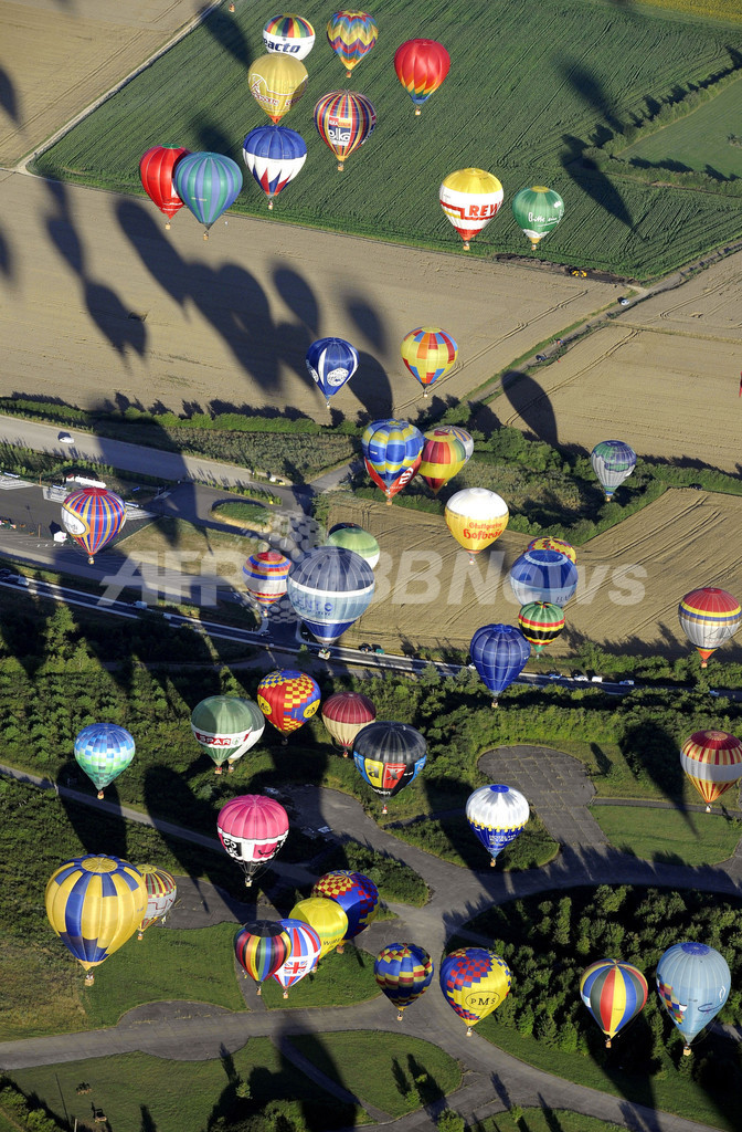 写真は、シャンブレー・ブシェール(Chambley-Bussieres)上空を飛行する色とりどりの気球(2013年7月31日撮影)。(c)AFP/ JEAN-CHRISTOPHE VERHAEGEN