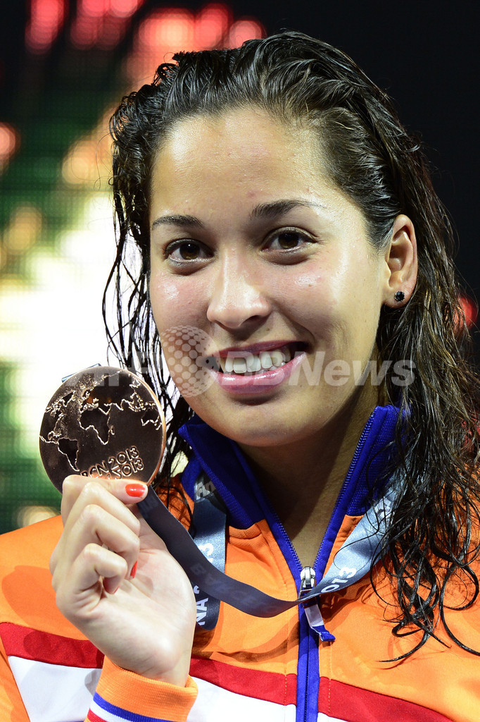 表彰式で銅メダルを手にするラノミ・クロモビジョジョ(Ranomi Kromowidjojo、2013年8月3日撮影)。(c)AFP/JAVIER SORIANO