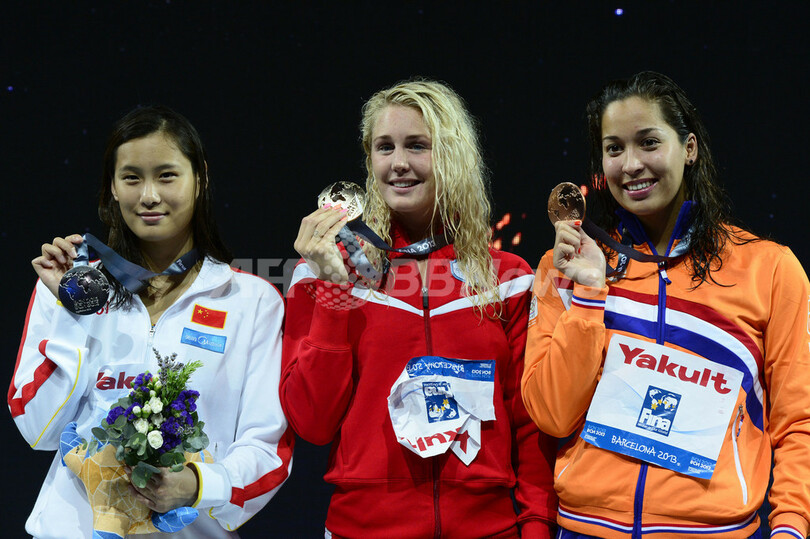 表彰式に臨む(左から)銀メダルの陸瀅(Lu Ying)、金メダルのジャネッテ・オッテセン・グレイ、銅メダルのラノミ・クロモビジョジョ(Ranomi Kromowidjojo、2013年8月3日撮影)。(c)AFP/JAVIER SORIANO