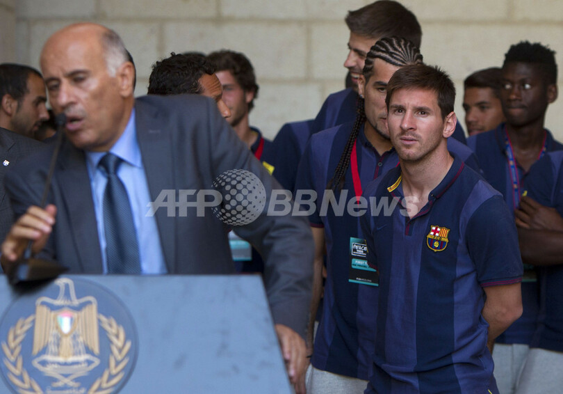 記者会見で発言するパレスチナオリンピック委員会(Palestine Olympic Committee)のジブリル・ラジュブ(Jibril Rajub)会長(右)を見守るFCバルセロナのリオネル・メッシ(2013年8月3日撮影)。(c)AFP/AHMAD GHARABLI
