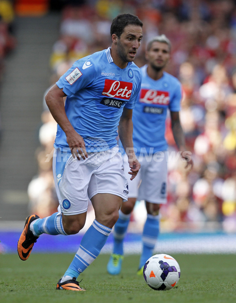 ドリブルでボールを運ぶナポリのゴンサロ・イグアイン(Gonzalo Higuain、2013年8月3日撮影)。(c)AFP/IAN KINGTON