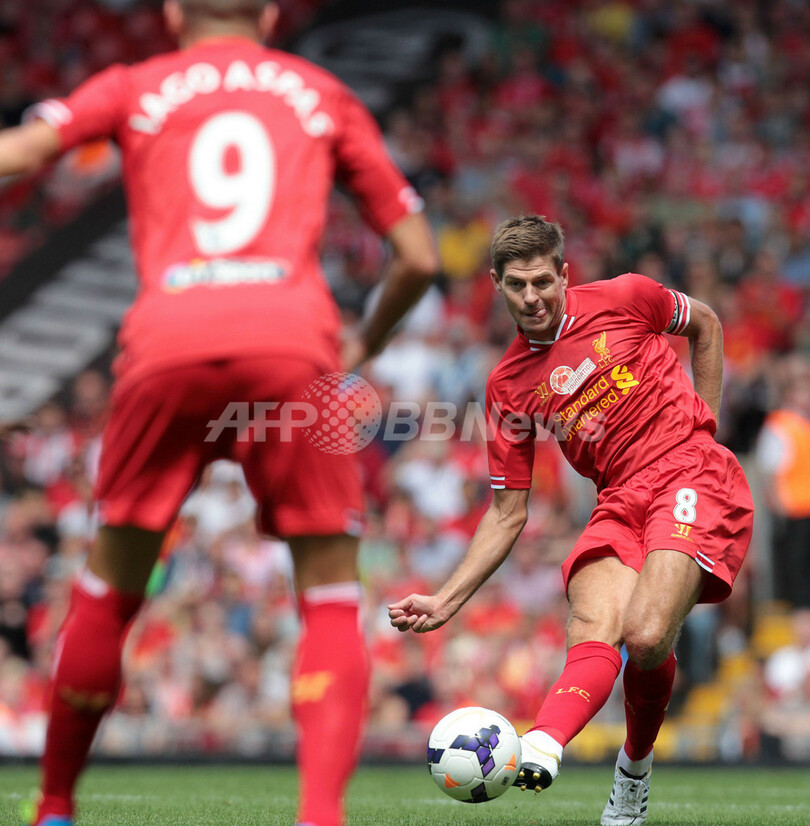 パスを送るリバプールのスティーブン・ジェラード(Steven Gerrard、2013年8月3日撮影)。(c)AFP/LINDSEY PARNABY