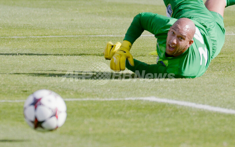 ゴールに吸い込まれるボールを見送るエバートンのGKティム・ハワード(Tim Howard、2013年8月3日撮影)。(c)AFP/Getty Images/Kevork Djansezian