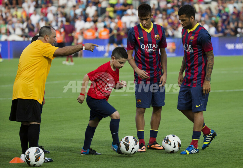 サッカークリニックに参加するFCバルセロナのダニエル・アルヴェス(Daniel Alves、右)とネイマール(Neymar da Silva Santos Junior、右から2人目、2013年8月4日撮影)。(c)AFP/JACK GUEZ