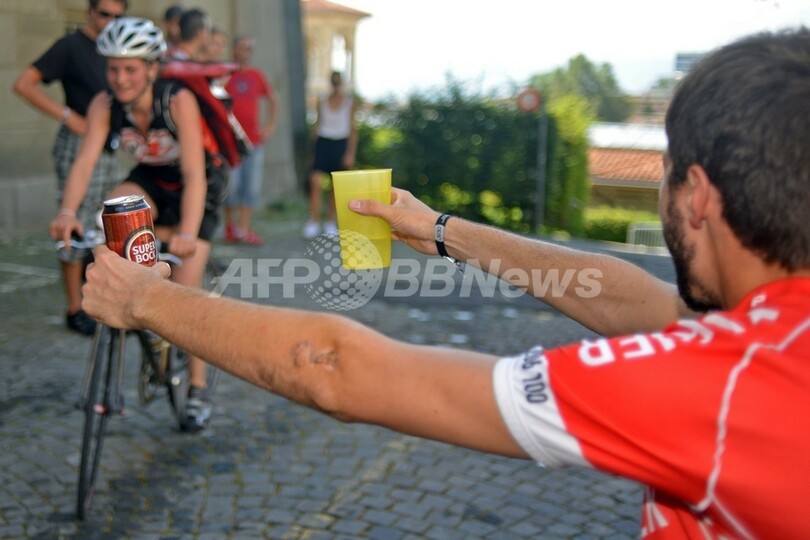 写真は、レース参加者に飲み物を差し入れようとする観客(2013年8月4日撮影)。(c)AFP/Harold Cunningham