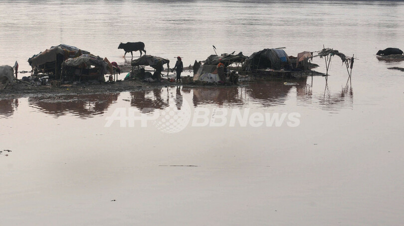 写真はパキスタンのラホール(Lahore)で、洪水で冠水した川辺で避難生活を送る住民(2013年8月4日撮影)。(c)AFP/Arif ALI