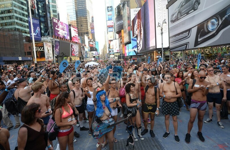 米ニューヨーク(New York)のタイムズスクエア(Times Square)で5日、「下着姿での最多集合人数」のギネス世界記録(Guinness World Records)への挑戦が行われた。これまでの記録は2270人(2013年8月5日撮影)。(c)AFP/Emmanuel Dunand
