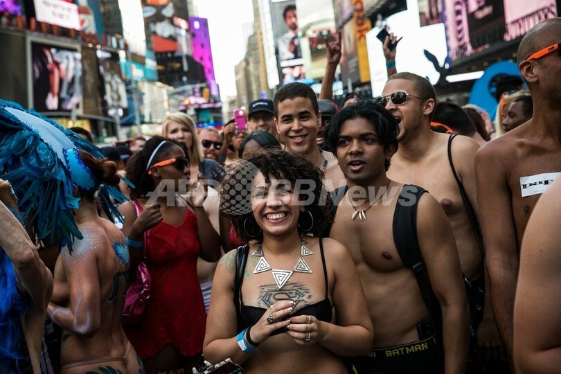 米ニューヨーク(New York)のタイムズスクエア(Times Square)で5日、「下着姿での最多集合人数」のギネス世界記録(Guinness World Records)への挑戦が行われた。これまでの記録は2270人(2013年8月5日撮影)。(c)AFP/Getty Images/Andrew Burton