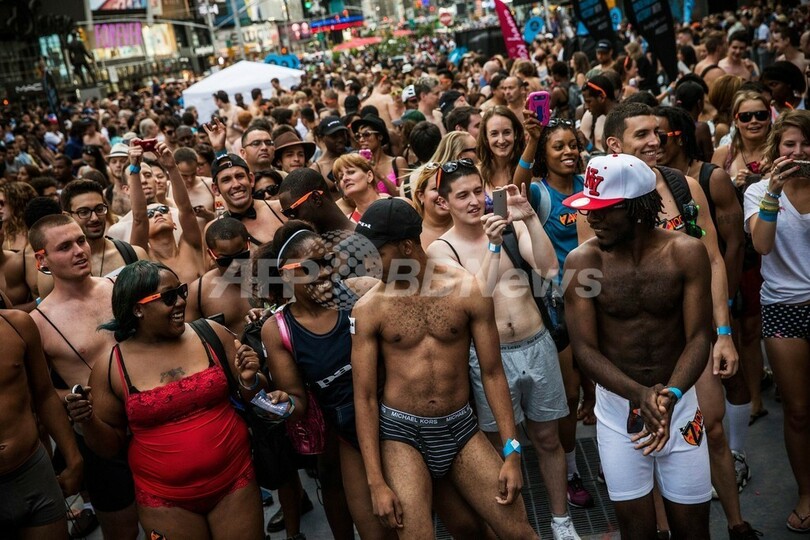 米ニューヨーク(New York)のタイムズスクエア(Times Square)で5日、「下着姿での最多集合人数」のギネス世界記録(Guinness World Records)への挑戦が行われた。これまでの記録は2270人(2013年8月5日撮影)。(c)AFP/Getty Images/Andrew Burton