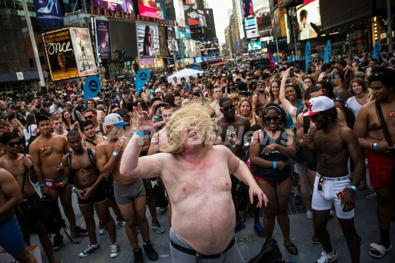 米ニューヨーク(New York)のタイムズスクエア(Times Square)で5日、「下着姿での最多集合人数」のギネス世界記録(Guinness World Records)への挑戦が行われた。これまでの記録は2270人(2013年8月5日撮影)。(c)AFP/Getty Images/Andrew Burton