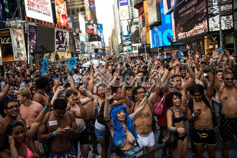 米ニューヨーク(New York)のタイムズスクエア(Times Square)で5日、「下着姿での最多集合人数」のギネス世界記録(Guinness World Records)への挑戦が行われた。これまでの記録は2270人(2013年8月5日撮影)。(c)AFP/Getty Images/Andrew Burton