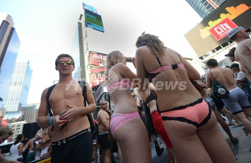 米ニューヨーク(New York)のタイムズスクエア(Times Square)で5日、「下着姿での最多集合人数」のギネス世界記録(Guinness World Records)への挑戦が行われた。これまでの記録は2270人(2013年8月5日撮影)。(c)AFP/Emmanuel Dunand